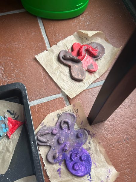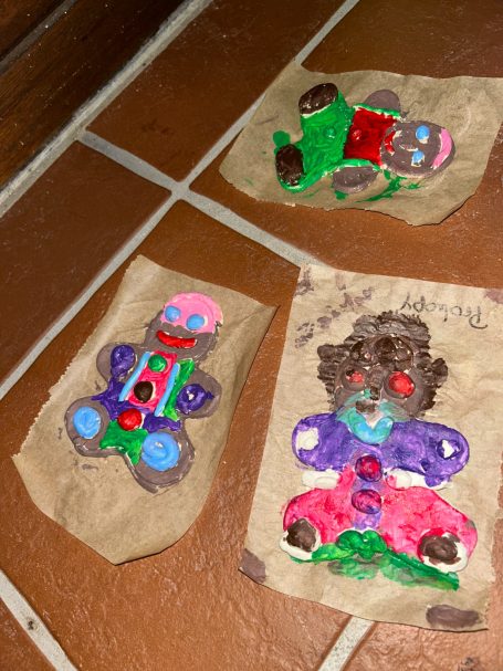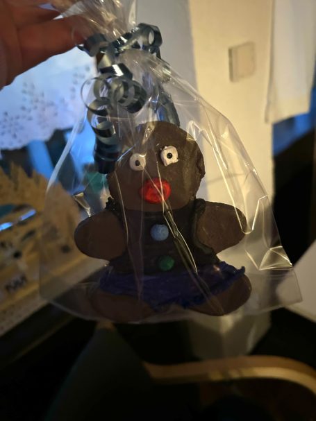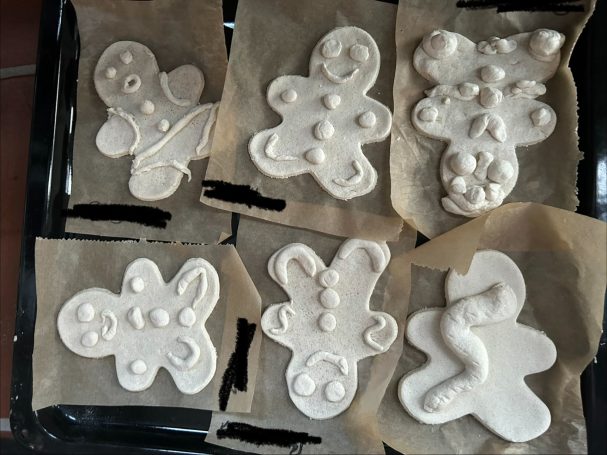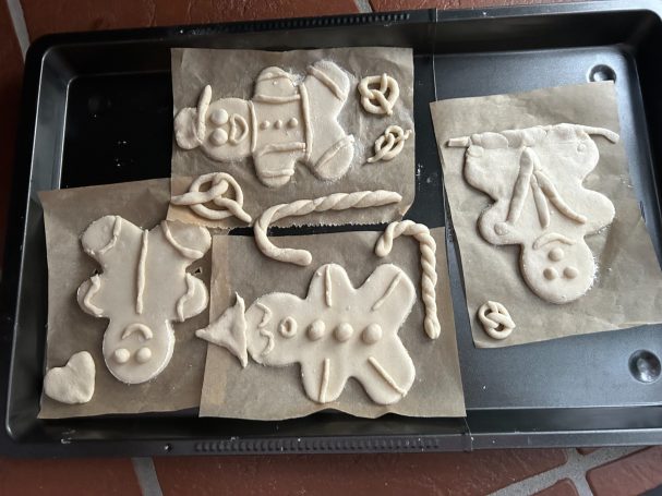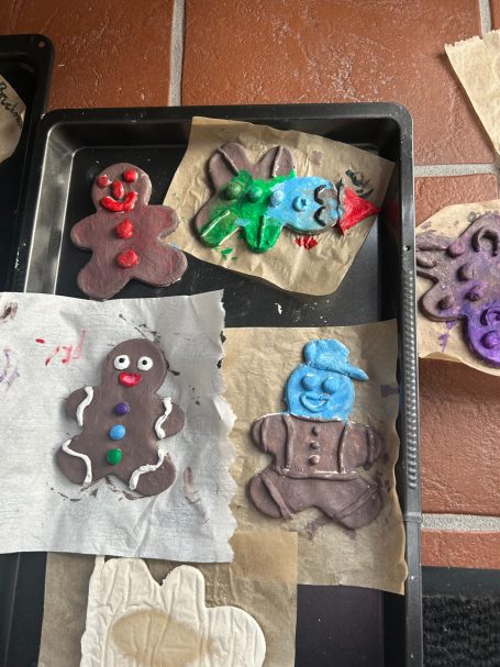 Passend zu Weihnachten hat jeder Gast ein Lebkuchenmännchen aus Salzteig geformt, gestaltet und wo sie trocken waren angemalt. Als letzter Schritt wurden sie von uns noch hübsch verpackt.